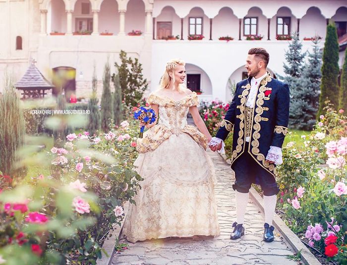 Hello! This is Sandra N, an artist from Romania. Recently I had my wedding, which, as a huge Disney fan, I made it all Disney themed: my dress (Belle), grooms outfit, the bridesmaids (each one a Disney princess), the parents, the godparents and most of the guests were Disney characters. Also, all wedding decor was Disney inspired, on the tables we had Lumiere, Mr. Pots, the Magic Rose from Beauty and the Beast, the candy bar was magical also, with Cinderellas shoes, crowns, tiaras, and, of course, magic castles. Everything was inspired by Beauty and the Beast. Our wedding dance was actually a duet: we both sang Tale As Old As Time, and, as the wedding reception was set in a French baroque-inspired mansion, we both had two exactly parallel stairways to go down from, just like the famous dance in Beauty and the Beast. We were both looking the same as the main characters. We managed to rent a fairytale looking, neo-romanticism style mansion, before the wedding ceremony, to take some photos and drink some tea, then we had our official ceremony in a beautiful, full of history, old church located in our hometown.