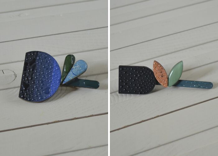 At times like this, I’m like my kid building his worlds out of a new LEGO. A lot of different parts made of wood are in a lot of boxes. And I’m looking forward to something amazing and new. I don’t know what I’m going to do today yet. It can be earrings, brooches or pendants, and maybe a necklace… And then flowers, planets or abstractions are obtained from geometric elements. And my favorite part of this process begins is to color all future jewelry. Choosing colors is always like magic.