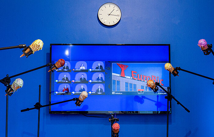 In 2021, as COVID policies started to loosen and galleries gradually opened for visit, I decided to develop an on-site installation based on “The First United Ice Cream Assembly Closes Today”. Authentic news is displayed together with the fabricated news, slightly in distinct settings regarding the exhibiting site. When the installation was first shown in the SAIC gallery at the School of the Art Institute of Chicago (2021), authentic live news online was streamed in the gallery. Same in Chicago, In Woman Made Gallery in 2023, “The First United Ice Cream Assembly Closes Today” and real news from 2020 was put together and presented as a two-channel video. Based on the context built by the video components from the installation, an AR filter of the Ice Cream Headquarter was designed to be viewed on the audience’s phone. A clock without numbers is set above the monitor(s), implying the lapse of time as the news plays. Ten hand-made artificial ice cream cones are attached to the microphone stands, responding to the chaotic controversies and filtered media representation with their own kind of absurdity. “sense” is an important motif for me to explore. Sugary, ice-cream-like fragrances were also infused into the exhibiting space as an additional layer of the meaning and experience of the installation.