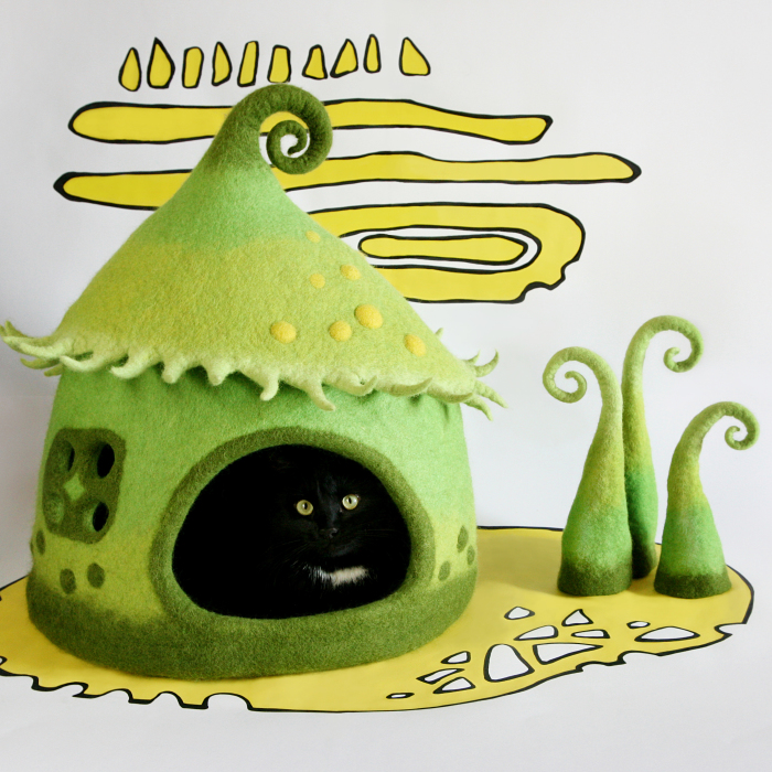Hi, am Yuliya Kosata. I live in Ukraine with my 3 cats so obviously i love those little furry bundles of joy. My felting workshop is in my home so all my cats are always around and closely participate in the process of my work. Cats love wool am working with and trying to nest in it all the time. More than that the remaining of wool i collect and keep in little plastic bags sometimes are being even stolen from all kind of secret places by these little thieves. Watching them nesting in the wool is probably how i decided to make their dream come true and started to make cat’s houses.
