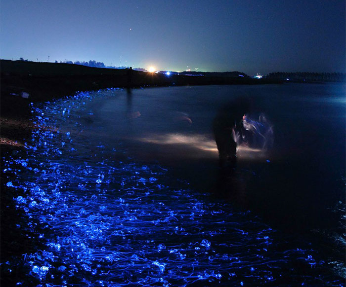 This is what happens on the earth. In spring, but not every year, bioluminescent firefly squid illuminate the Toyama Bay, Japan.