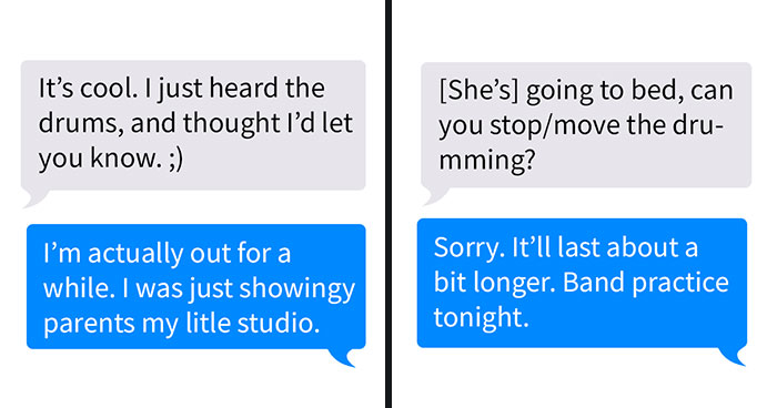 One day, the author warned his neighbors that he was going to have a band practice. “Wednesday. Really, it consisted of me and my guitarist friend playing through headphones. My girlfriend couldn’t hear us 10 feet away,” he wrote. He told them that it would last from 6 to 8 PM and they agreed to it. At 7:38 PM, the guy received a message from the neighbors asking him to stop drumming. The guy politely replied by telling them that it would last a bit longer.
