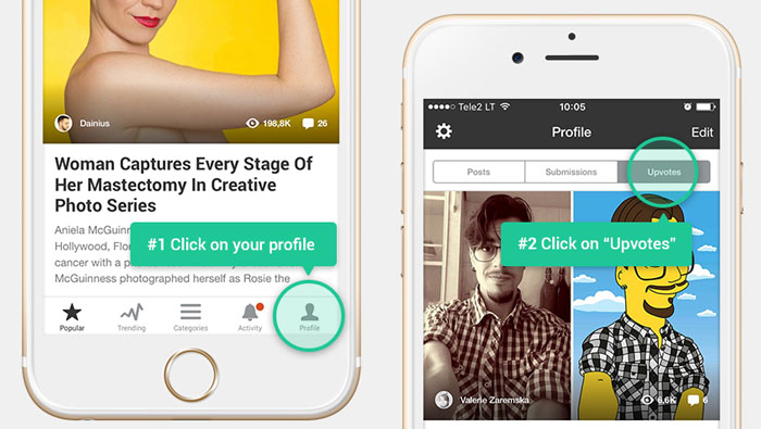 2. You will see POSTS, SUBMISSIONS, and UPVOTES. Click on UPVOTES to see a list of every article and image that you have upvoted.