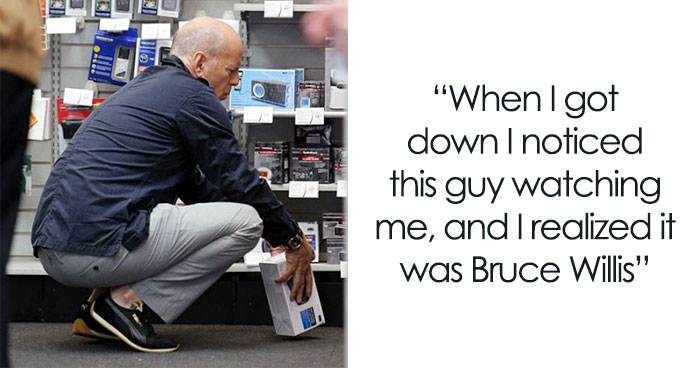 I was in walmart and there was somethng that i needed on the top shelf and near the back. at the time i was only 5foot (im a bit taller now). and so I scaled up the shelf and over to the side to get the food item that i needed. When i got down i noticed this guy watching me, and i realized it was Bruce Willis. and he complimented my shelf climbing.”