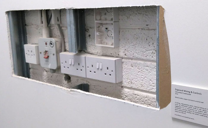 The employee attached a simple art museum style paper plaque next to the exposed wall, titling to “exhibit” ‘Exposed Wiring & Controls.’ Ironically enough the company Murphy works for is a print, signage and design company, based in Galway, Ireland.