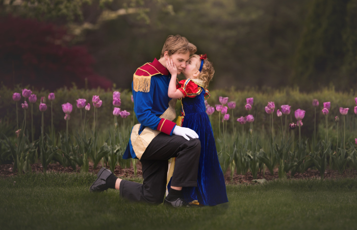 The inspiration behind the photo shoot came about after the birth of my 7th child, I was looking online at princess gowns for myself (I’m a shameless Disneyphile and thought maybe buying myself a princess gown would motivate me to lose the weight left over from my recent pregnancy) when Anthony spied a Prince Charming costume. That’s when he took over the search. He looked at me and asked if I would buy him one of the prince costumes. He said he would like to dress up and plan a photo shoot for Belle, since we had recently celebrated her birthday. As both their mom, and a photographer, I was all about it! We set to work putting together the Prince Charming costume right down to the white gloves and the black shoes that he shined himself the old fashioned way, with solid polish and an old rag. Then he chose a Snow White dress to match the blue and red costume he had chosen for himself.