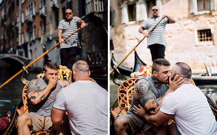 Body builder Patrick Huber wouldn’t even tell his Olympian counterpart, Jimmy Sjödin, where they were going when they left their Munich home by car in July. They eventually reached Venice, Italy, a place Jimmy had always wanted to visit, where Patrick had arranged for a travel photographer from Flytographer to take secret snaps of their sweet adventure. When the pair set off on a romantic gondola ride on the Venetian Lagoon, Patrick knew the time was right, and popped the question.