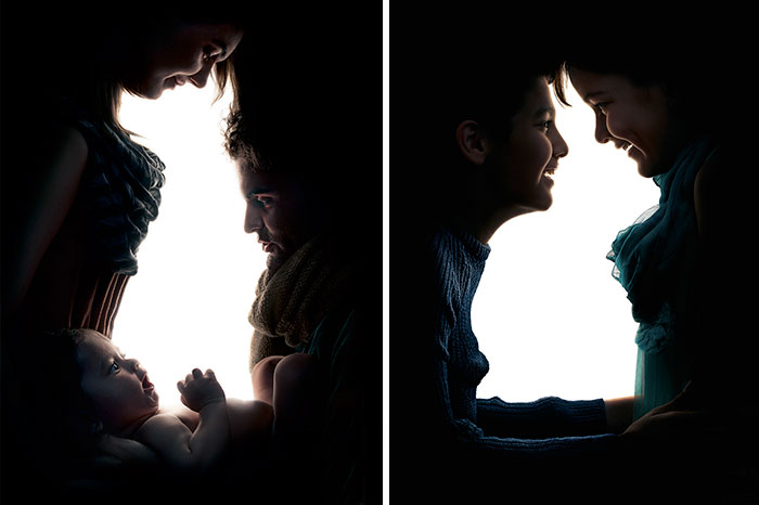 Using clever lighting and framing techniques, the creative duo made a series of optical illusion portraits that contain two images in one. The artists arranged their portrait subjects to create an animal shape in the negative space between them. Everything came together when they turned on a super bright backlight and placed gentle fill light in the front, perfect for the tagline “There’s always room for more. Adopt.”