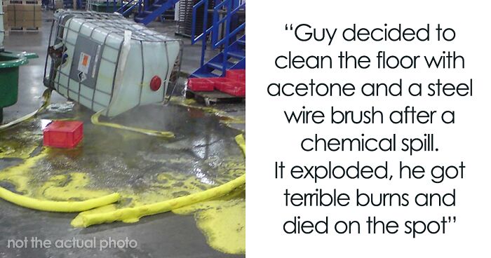 Not the OSHA guy, but it happened in the plant I was working in. Idiot is told by junior manager to clean the floor after a chemical spill (I don’t recall what it was for certain, but we used a LOT of industrial adhesives, so maybe that). Idiot ignores all his safety training, and the entire closet full of cleaning gear, and decides to clean the spill with acetone. And a steel wire brush.