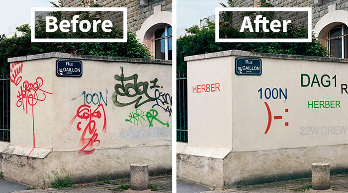 Mathieu Tremblin is a French artist who decided to fix this. He paints over the ugly graffiti and makes them legible.