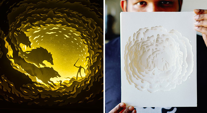 The Colorado-based artists, who are originally from India, were inspired by Balinese shadow puppets but have since developed their own unique art style. Here’s what they have to say about working with paper: “Paper is brutal in its simplicity as an art medium. “What amazes us about the paper cut light boxes is the dichotomy of the piece in its lit and unlit state, the contrast is so stark that the shadow effect has this mystical effect on the viewers. “