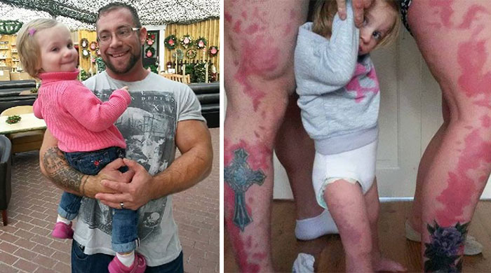 Large and obvious birthmarks can make school life hard for children, but a couple of caring parents in the UK have found a controversial way to combat this issue. Tanya and Adam Phillips got huge tattoos stretching up their right legs to match the birthmark that their 18-month-old daughter, Honey-Rae, has on her leg.