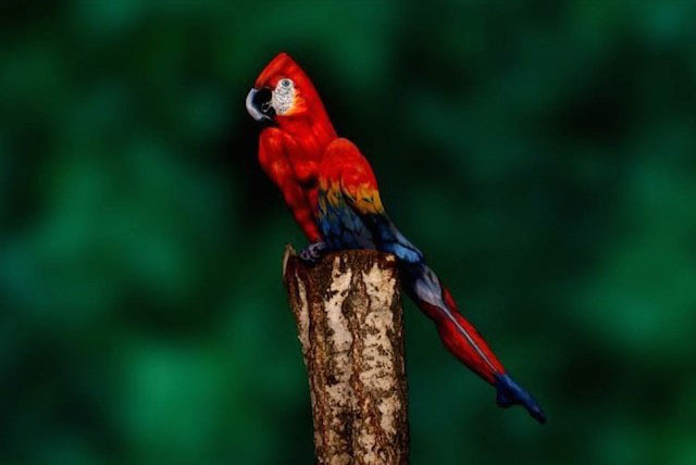 Johannes Stoetter, the talented artist whom we previously wrote about here, is back at it again with more incredible body art. This time, his colorful and detail-oriented paintbrush has transformed a patient model into a beautiful and bright macaw parrot.