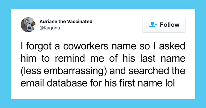 Has it ever happened to you that you forgot a person’s name immediately after someone told it to you? Well, you’re not alone. Below is a list of posts shared by people on Twitter as a response to a viral Tweet. Kristen Mulrooney, who goes by @missmulrooney on Twitter, shared a simple story of how her husband just simply said “I’m sorry, I forget your name?” But turns out that people on the internet have more stories related to forgetting people’s names and even more clever hacks for getting themselves out of a potentially embarrassing situation. Don’t forget to vote for the best posts and leave your comments!