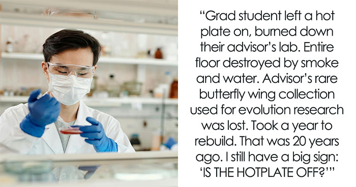 Grad student left a hot plate on, burned down his/her advisors’ lab, entire floor of the building destroyed by smoke and water damage. Nobody k***d but the advisor’s rare collection of butterfly wings went up in. smoke – he’d been studying evolution of butterflies and had to abandon that. Took about a year to rebuild everything and get back on track.