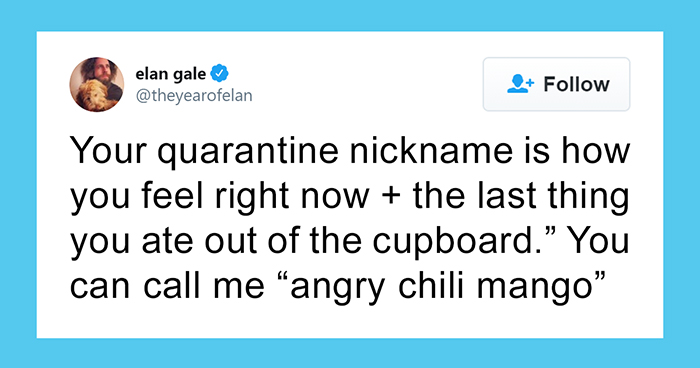 Twitter is on fire! With so many people sitting at home and having a lot of time on their hands, many are turning to Twitter for some light-hearted entertainment and humor to take their minds off the threatening virus. So when TV producer Elan Gale (best known for working on The Bachelor and The Bachelorette) suggested that people share their “quarantine nicknames,” hilarity ensued. “Your quarantine nickname is how you feel right now + the last thing you ate out of the cupboard. You can call me ‘angry chili mango,'” he tweets, receiving tons of silly but amusing responses. Scroll down below to read all of the nicknames and don’t forget to share yours in the comment section!