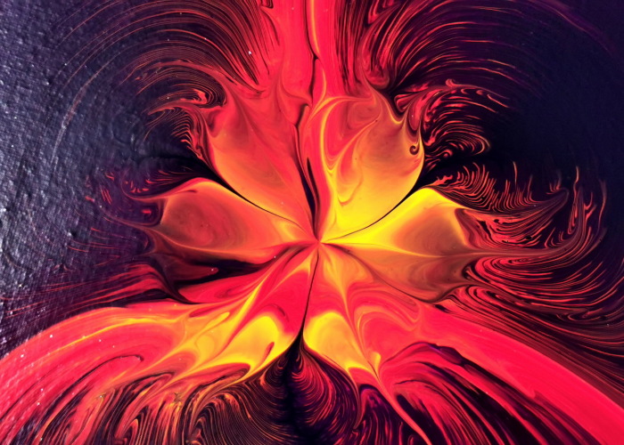 The materials I used are a 12-inch round canvas, acrylic paints mixed with pouring medium, flower-shaped dessert cup, wooden skewer, palette knife, torch.