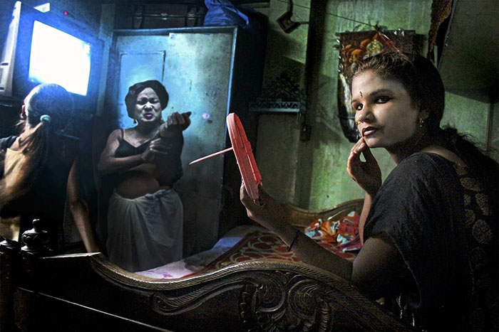 This is what Datta wrote when he uploaded the photo to Scribbler: “Radhika, 17, in the room of a veteran sex worker, Asma, in Sonagachi (featured dressing in background). The two have grown close over Radhika’s period here; she respects and learns from Asma’s experience and matter of fact, survival attitude, while Asma feels a fondness for Radhika’s unfettered ‘kindness, curiosity’ and innocence. Strong bonds can often form within brothels as girls learn to support each other and find self-empowerment through group assertion and collective experience.”