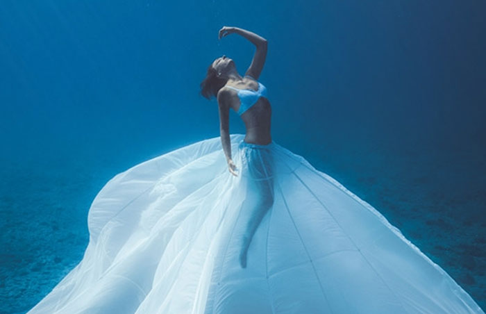 Astonishingly, the photo is not a composing. It was taken in Croatia in 12m depth. The dress is a parachute.