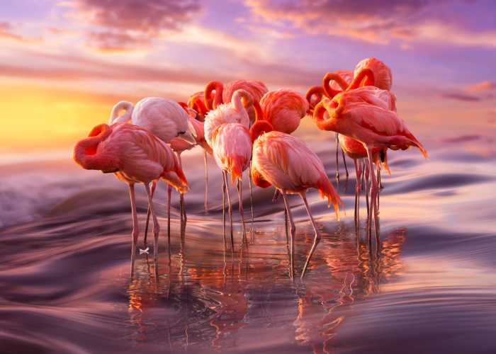 Since the plastic garden beauties were created inspired by the actual colorful birds, let’s find out more about them. There are six species of modern flamingos, and most of them live in Asia, Africa, and South America. These pink animals get their color because of carotenoids (naturally occurring pigments) in the food they eat (shrimp, algae, and plankton). If they’re not getting the right diet, their color fades. It takes up to three years for baby flamingos to turn their gray feathers into a colorful coat.