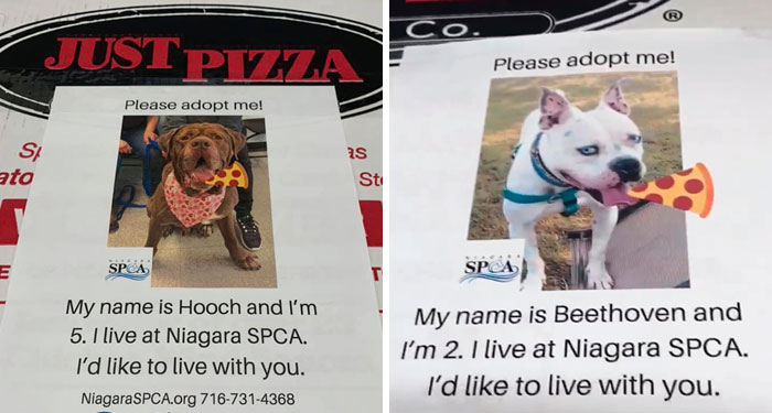 Animal rescue organizations often have to get creative to help cats and dogs find their forever homes. One of the most effective ways is to team up with local businesses. That’s exactly what Niagara SPCA did and achieved some amazing results. The no-kill shelter located in Niagara Falls, New York recently went viral after they teamed up with the Just Pizza & Wing Co. franchise in Amherst in an attempt to help dogs get adopted. The idea they came up with together is absolutely brilliant. They decided to put flyers on pizza boxes, which feature photos of dogs that are looking for new owners.