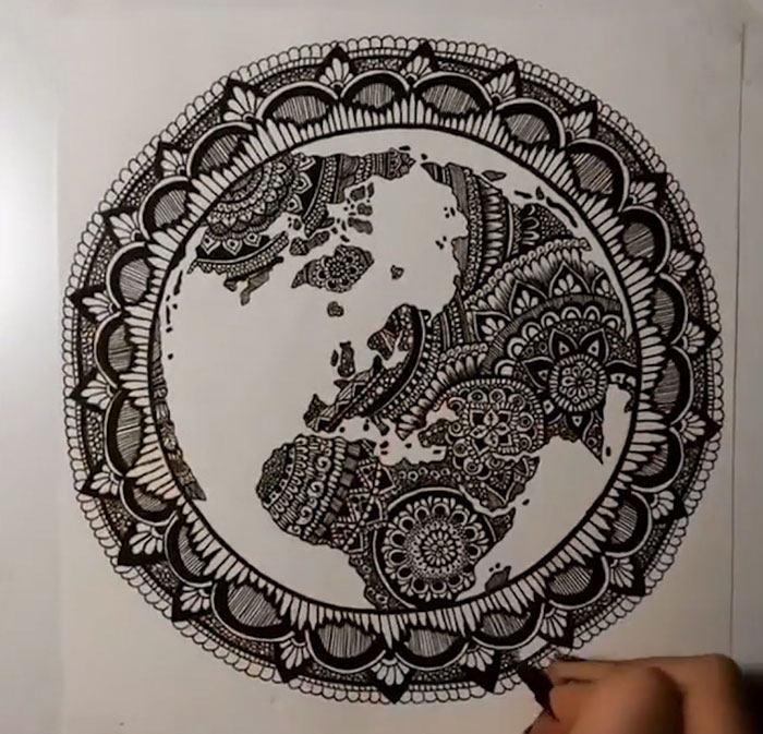 Yolande Holowaty is a 17-year-old Australian who is obsessed with art. She turns this obsession into quirky drawings that are full of small details, and somehow really calming to look at. As she says on her website, her goal is to spread love and joy around the world with her artwork. And by saying this she probably meant literally since she just turned the Earth into one intricate mandala.