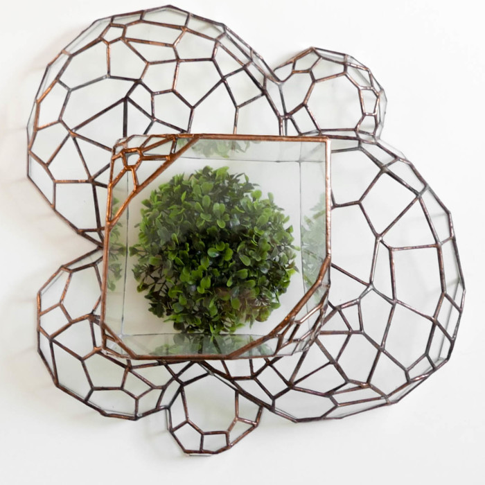 Check out these cellular decor elements made by Nightshade Studio. It’s a creative and awesome-looking mixture between greenery, sand, glass, and metal, all shaped by a geometric porous polygonal form.