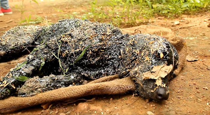 A puppy who had fallen into hot tar and got paralyzed from head to toe was lying on the road just waiting for its death to come. Some people passed by the pooch, but as the tar made the doggie unrecognizable, the puppy was ignored, until one kind-hearted person heard the dog’s cry for help. The savior immediately phoned India’s Animal Aid Unlimited and help was on its way!