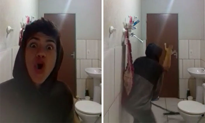 There’s a rat in your bathroom. What do you do? This guy from Brazil takes what appears to be a reasonable approach, arming himself with a broom to flush out the rat, and his cat to finish the job. Cats are supposed to useful for catching rodents right?