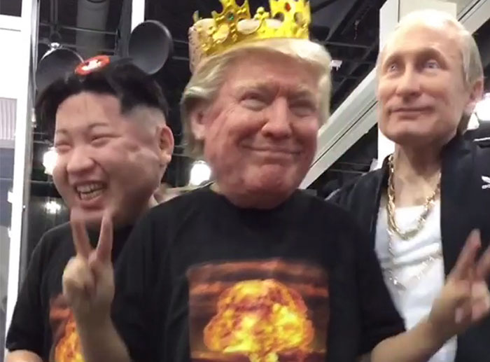 No, this isn’t footage of Donald Trump dancing with Vladimir Putin and Kim Jong-un and no, nobody peeled their faces off to wear in public. Believe it or not, these are actually masks by Colorado-based artist Landon Meier (previously here). “I try to pick characters, people who’ll be fun to run around scaring people with,” Meier told BuzzFeed News. “I try to pick topical stuff and right now, with the political atmosphere, everyone is so polarized and angry. So I thought it would be fun to lampoon each one of them.” Each piece takes Meier weeks, sometimes months, of sculpting, silicone casting, and careful paint and hair work. “It’s a fine art product. It’s wearable art.”
