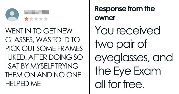That’s exactly what happened to one company that sells glasses. After somebody who got 2 pairs of free glasses and a free eye exam left a 1-star review and complained, the owner of the company couldn’t take it anymore and called them out for being ungrateful.