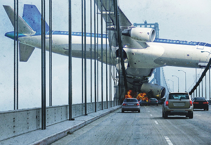 Digital art by Canadian graphic designer Steve McGhee depicting catastrophic events such as planes crashing, cities destroyed by tsunamis, aliens invading, and other end of the world scenarios.