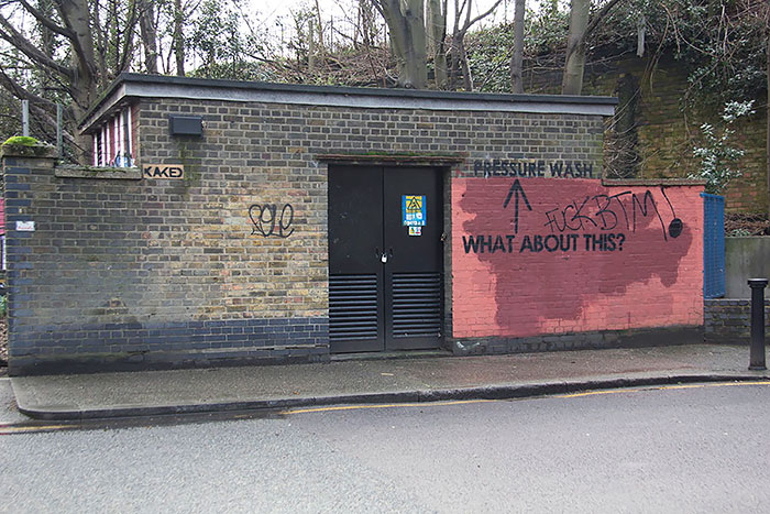 “I cycled past this street of London on the way to work for years,” he writes on his website. “I noticed that graffiti stencil painted within the red area was ‘buffed’ with red paint. However, graffiti outside of the red area would be removed via pressure washing. This prompted the start of an experiment, or, if you like, an act of vandalism. Unlike other works, I was very uncertain as to what results it would yield. Below is what transpired over the course of a year.”