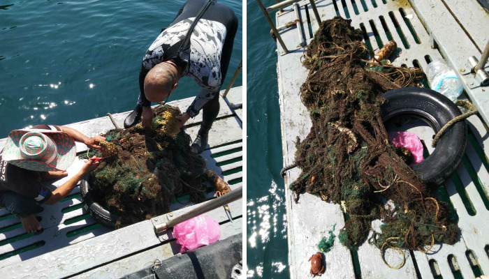 How to successfully remove an abandoned fishing net with over 250 kg in weight and 100m in length.