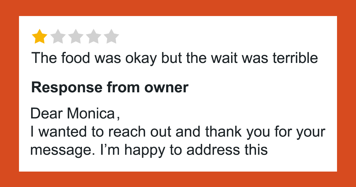This response to a one-star review, shared by Imgur user ctrclub, is a perfect example of this. The restaurant and the customer are both unknown, save for the name ‘Monica,’ but if you run a business and encounter unfair reviews, this is a great example to learn from. Scroll down below to check it out for yourself, and let us know what you think in the comments! (Facebook cover image: Iain Farrell)