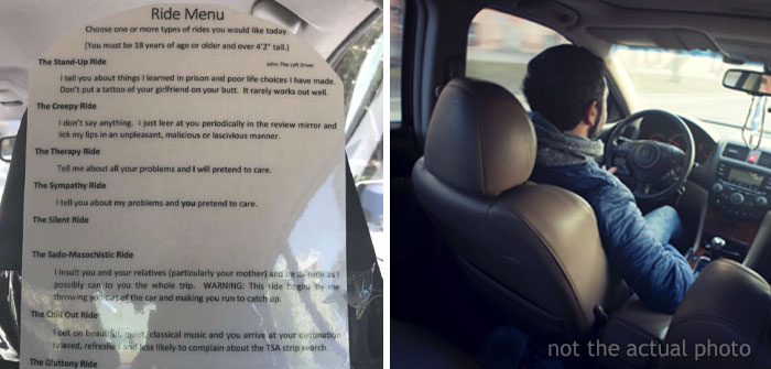Once, we had simple yellow cabs with drivers who would yell at you if you’d ask to turn the music down because you have an incoming call from your mom. Today, the drivers are on a completely different game and are offering services way beyond just driving. You may remember the time Bored Panda did an article about an awesome Uber driver named George. He upgraded his driving services to a whole new level by offering his passengers to choose from the ‘ride type menu’. This time, we have another badass driver in town and he goes by the name John. The guy leveled up the ‘ride type menu’ and it went viral for all the right reasons.