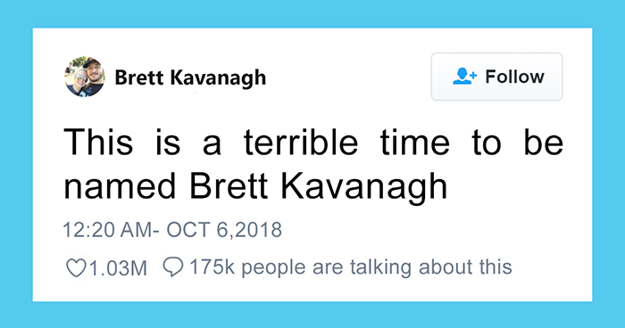 “I had a couple of beers and I was like ‘You know what, I’m just going to throw this out there,'” Kavanagh told the Louisville Courier Journal. “I thought to myself, ‘This is a terrible time to be named Brett Kavanagh.”