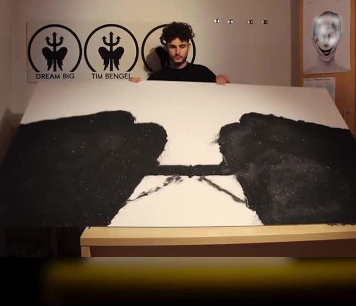 German artist Tim Bengel has developed a unique style of painting by using two uncommon materials for the craft – sand and gold. Starting with a sticky empty canvas, Tim creates a design with black sand and gold (this “drawing” can take weeks), and then fills the rest with white sand. When Bengel dumps the remaining sand, a picture appears. In fact, Tim uses so much sand, that even he actually witnesses the image himself only when the sand is tipped off.