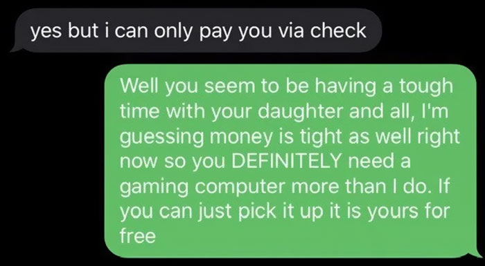 The good thing is that these thieves aren’t always very bright, which doesn’t get them very far. Take, for instance, this guy who texted a Reddit user ShankABee because he wanted to buy his gaming computer and created the dumbest excuse for why he can’t pay for it in cash. Luckily, the seller didn’t fall for his lies and decided to troll him. The conversation turned out to be hilarious and even went viral.