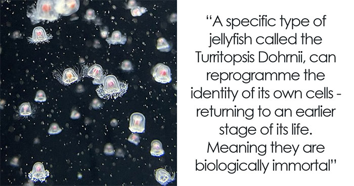 A specific type of jellyfish called the Turritopsis Dohrnii, can reprogramme the identity of its own cells – returning to an earlier stage of its life. Meaning they are biologically immortal.