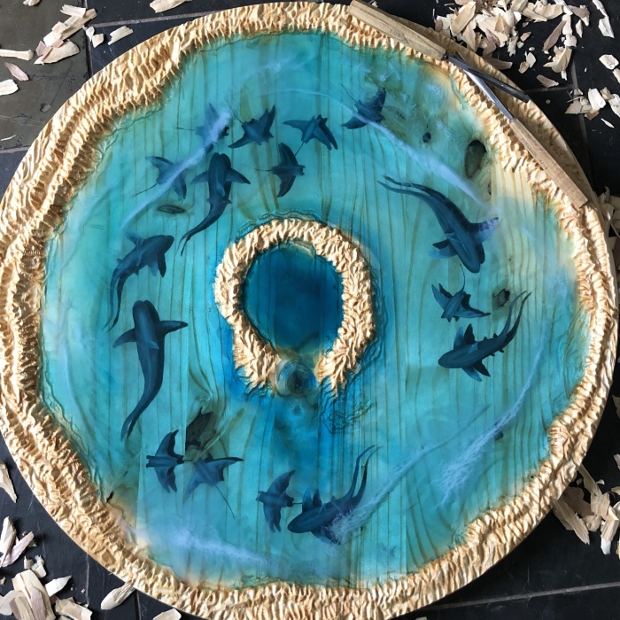 Hello everyone! I’m an artist that creates both abstract pieces, and topography maps using only hand chisels. This piece was hand-carved, hand-painted, then filled with epoxy to create depth. Check out my webpage if you want to see something more like this! Enjoy.