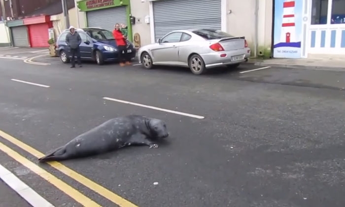Sammy the seal has found a better way to get fish than hunting them himself. Recently caught on tape, he’s seen crawling out of a harbor and crossing a two-lane street aiming for the Lighthouse Seafood Restaurant in Wicklow, Ireland. The smarty pants does it every day!