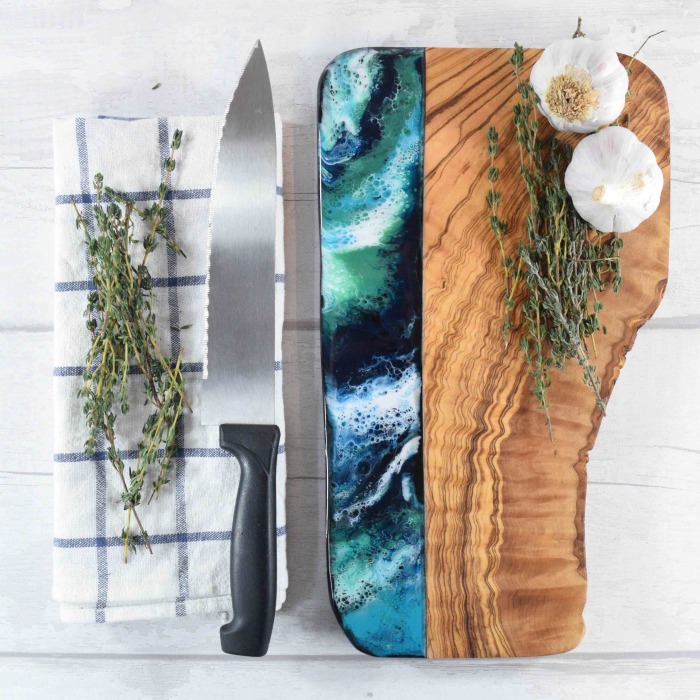 Each resin art board takes several days to complete, with many steps involved in the process. It’s definitely a messy business! The floor in my studio is absolutely COVERED in resin – I always change into my ‘resin shoes’ so that my regular ones don’t get destroyed!