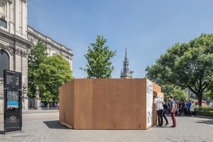 Open during London Festival of Architecture, The Building Site addressed the growing concern around the changing ownership of public spaces and city gardens in London and invited its visitors to reflect on the consequences of urbanization on local communities and natural ecosystems. The installation occupied a significant surface of public space, creating an alternative construction site – a signature mark for London in transition. Utilizing the aesthetic of a temporary hoarding from the outside, the pavilion offers a beautiful forest-like experience from within.