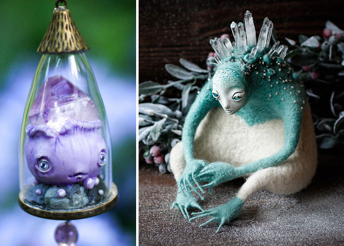 All the brooches and earrings are handmade and created of polymer clay, organic crystals and gemstones. The boxes are decorated with the pyrography technique and seem to be created for witches and warlocks so they could keep ingredients for magic potions — little mandrake roots, herbs and poisonous mushrooms. But what amazes me most is a bunch of fairy spirits. Slavic forest Auka is made of felt and likes kindly mocking at guests. Woolen Icci, keeper of the mountain caves, is very calm and dreamy. And Fly Agaric Boy likes playing with little plush Flowering Bulbs. Come closer and you will see it all with your own eyes!