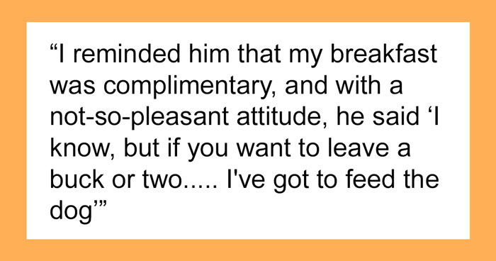 Despite the OP leaving their breakfast card in plain sight on the table, the server brought them a check and asked for a tip. When the OP pointed out that the food was supposed to be ‘on the house,’ the server, not very pleasantly, answered that he was aware, but in case the guest wanted to leave a tip, it would be nice, adding that he has to feed his dog.