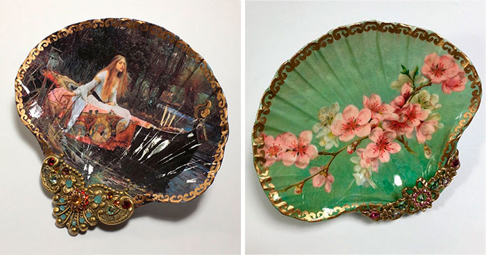 Curious how her beautiful artwork is made? Kenyon’s detailed art is made by decoupaging an image onto the real seashell’s surface. Then, she carefully paints small decorative details in brass or Swarovski rhinestones. In this way, her art projects look like from the Victorian era, perhaps belonging to an aristocrat.