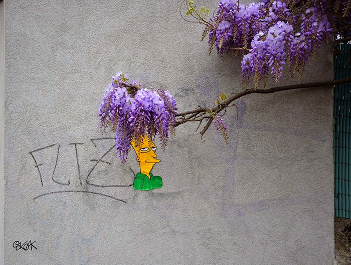 Sideshow Bob, the notorious serial killer from the Simpsons, just got a fabulously flowery new hairdo thanks to OakOak, a wonderful street artist based in France whom we previously wrote about here. A branch with purple flowers in the streets of his native Saint-Etienne in France became the trademark mop-style hairdo for Bart’s evil nemesis.