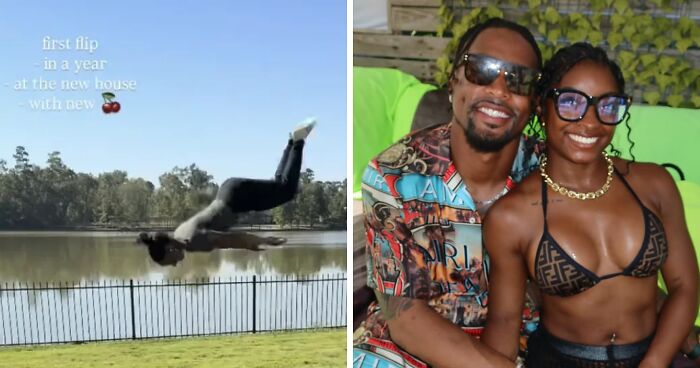 The Olympic champion shared a video of herself doing a backflip on her trampoline, writing, “first flip – in a year – at the new house – with new (cherries).”