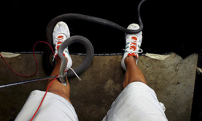 One of the snakes selected for the book was the deadly black mamba, a highly aggressive and venomous snake from the African continent. Despite safety precautions during the shoot, an accident occurred while the owner went to retrieve the snake with a hook. The hook instead snagged a red photographic cable that was nearby, this spooked the mamba which then lashed out at the photographer’s leg. Blood began to gush from the wound and Laita immediately feared the worst. “Oh f**k,” was his initial reaction, according to an interview with Strange Behaviors.